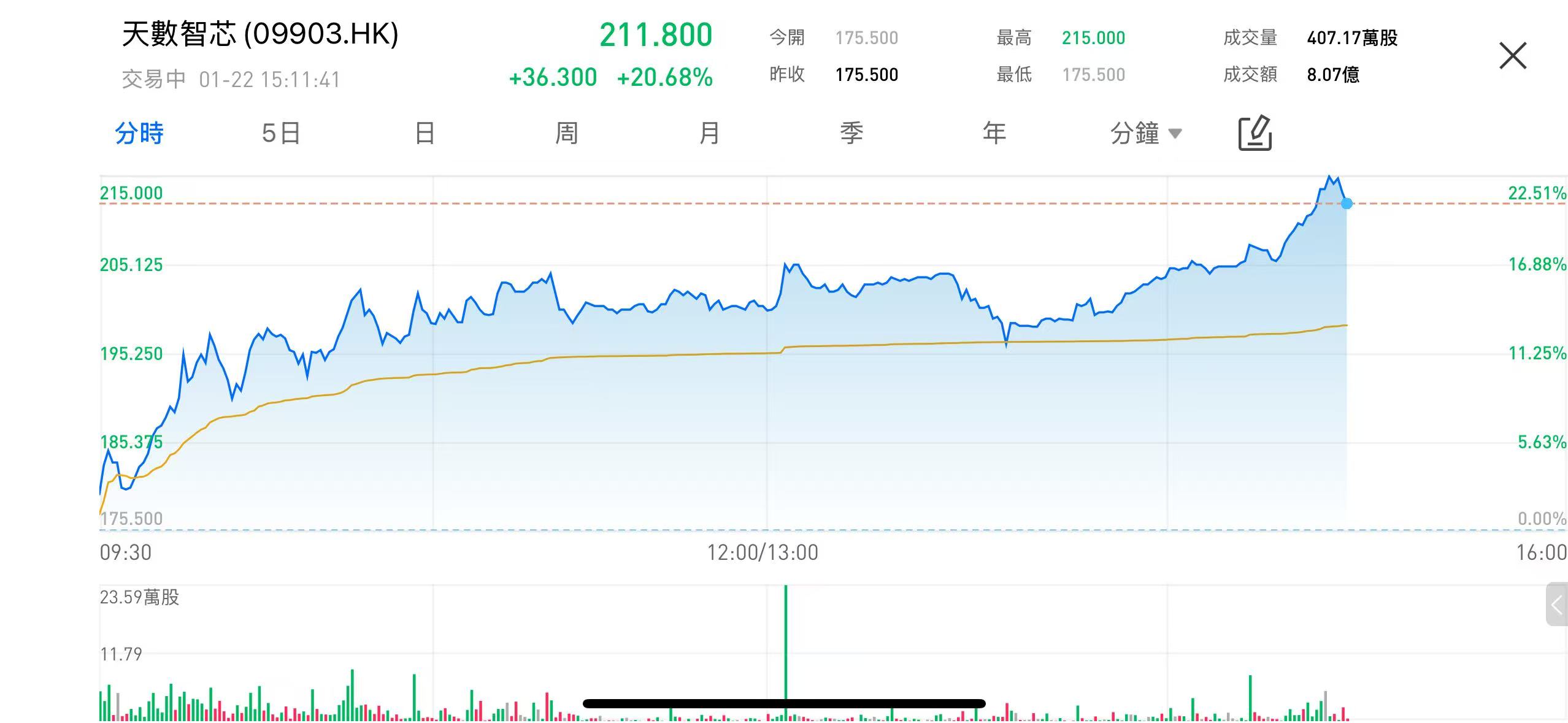 1月22日,國產GPU企業天數智芯(09903.HK)盤中股價大幅走強,一度漲逾20%,股價升至215港元附近,漲幅在港股科技板塊中較為亮眼。市場關注焦點集中於公司即將發佈的未來產品規劃,以及國產GPU在高端AI算力領域的最新進展。