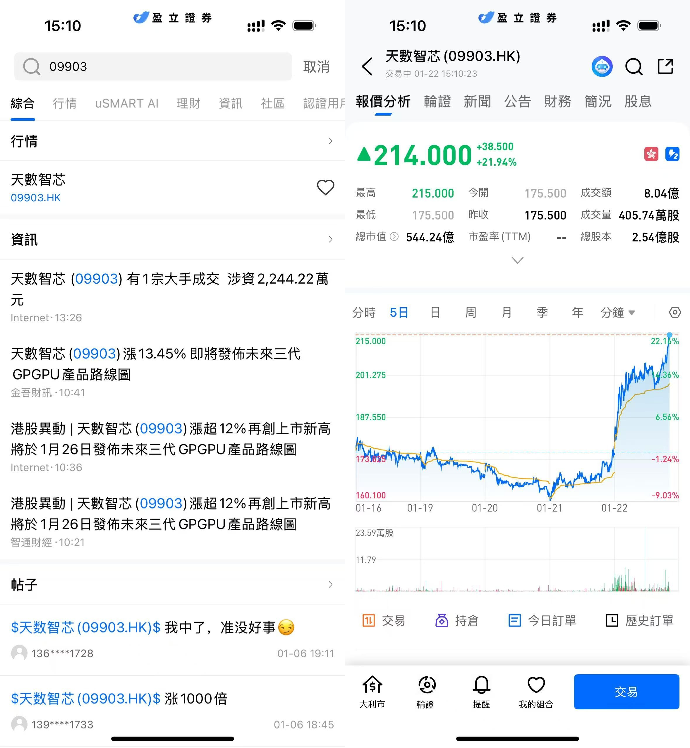 登入 uSMART HK APP 後,於頁面最右上方點擊「搜索」,輸入標的代碼(09903.HK)並進入詳情頁,瞭解交易詳情與歷史走勢。點擊右下角「交易」,選擇交易類型,最後填寫交易條件後送出訂單即可。