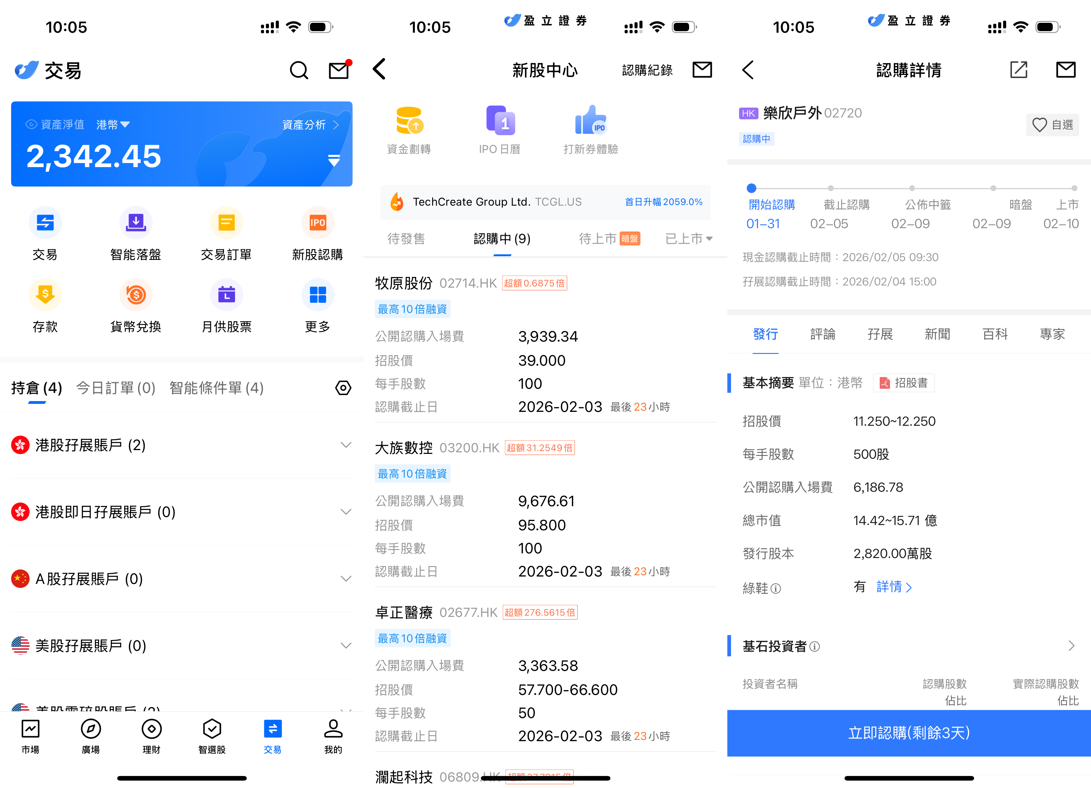 uSMART HK App 設有 IPO 中心,提供獨家優惠,客戶可在 App 即時認購公開發售之新股。登入 uSMART HK App 後,點選右下角「交易」,進入「新股認購」,選擇樂欣戶外後點擊「公開認購」,填寫認購數量並提交訂單即可。