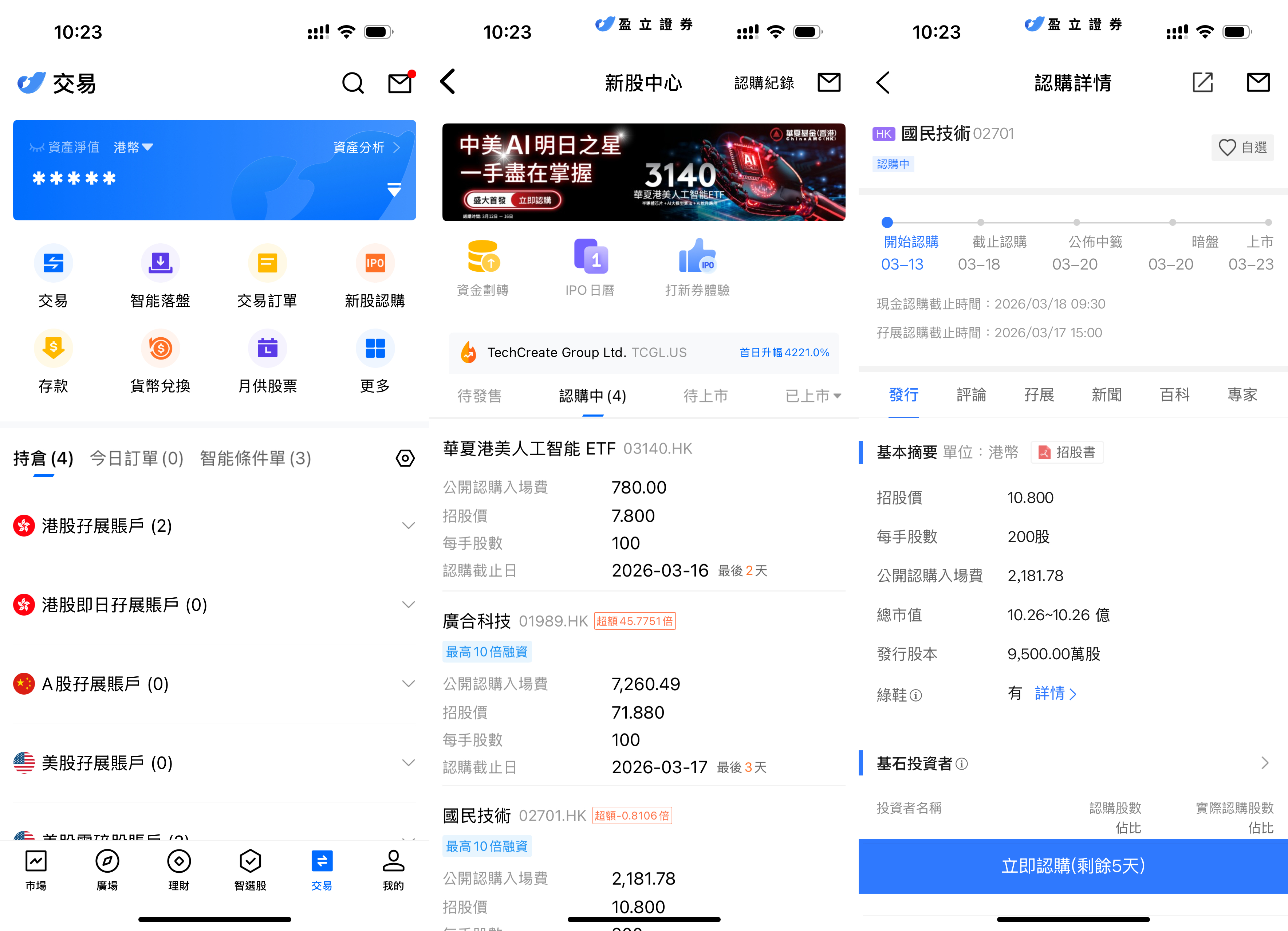 uSMART HK App 設有 IPO 中心,提供獨家優惠,客戶可在 App 即時認購公開發售之新股。登入 uSMART HK App 後,點選右下角「交易」,進入「新股認購」,選擇國民技術後點擊「公開認購」,填寫認購數量並提交訂單即可。