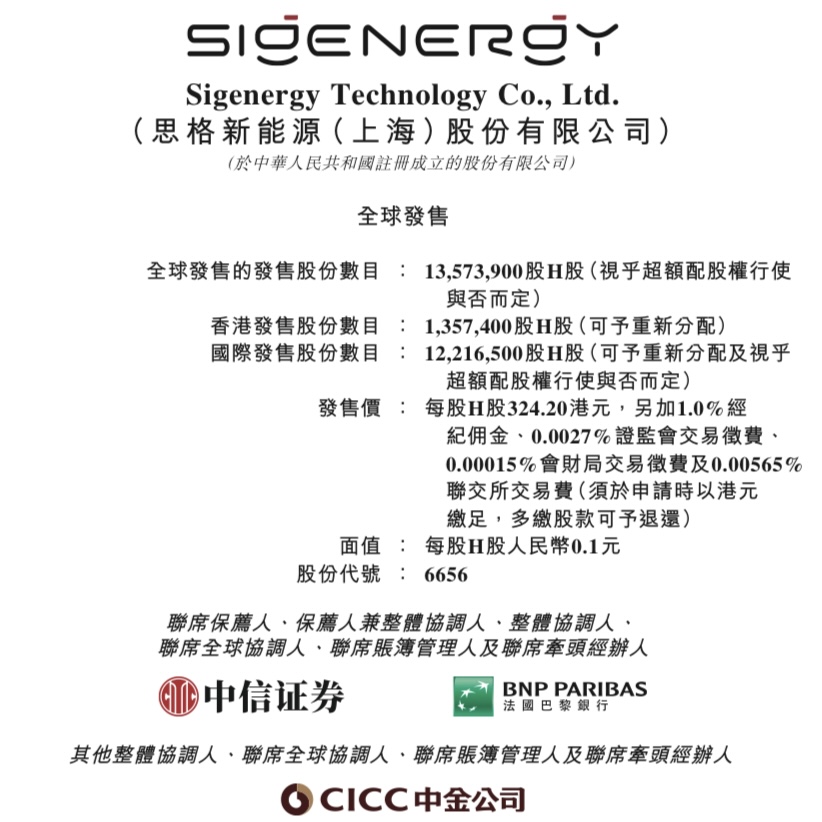 思格新能源(上海)股份有限公司(Sigenergy Technology Co., Ltd., 06656.HK)啟動香港IPO,招股期為2026年4月8日至4月13日,擬全球發售13,573,900股H股,並設15%超額配股權;發售價每股H股324.20港元,每手100股,入場費約32,746.96港元;預期4月16日於聯交所主板掛牌,中信證券(香港)及法國巴黎證券(亞洲)為聯席保薦人。