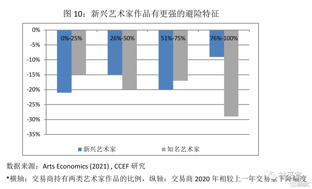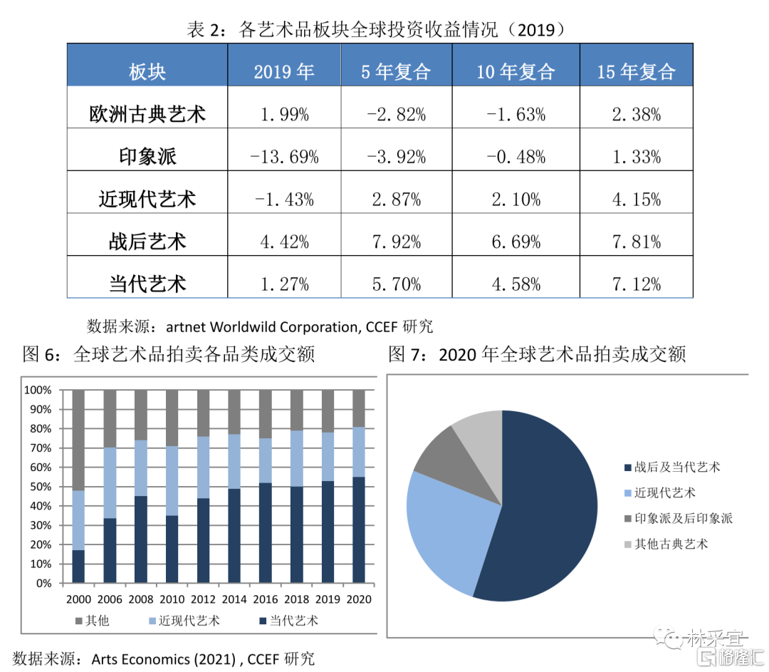 同样,海外艺术品市场的现代、尤其是二战后至今的当代艺术品的收益率在不同持有期限中均高于近代与古典作品。因此,对现当代艺术品的偏好已成为全球艺术品投资的普遍趋势。2000年,以印象派及更早的古典艺术为代表的品类在全球公开拍卖市场成交量的占比超过50%,这一份额在其后的20年里被迅速崛起的当代艺术交易所挤占。2020年,当代艺术品在全球拍卖成交额与成交量中的占比均达到55%,成为全球艺术品投资的核心品类。
