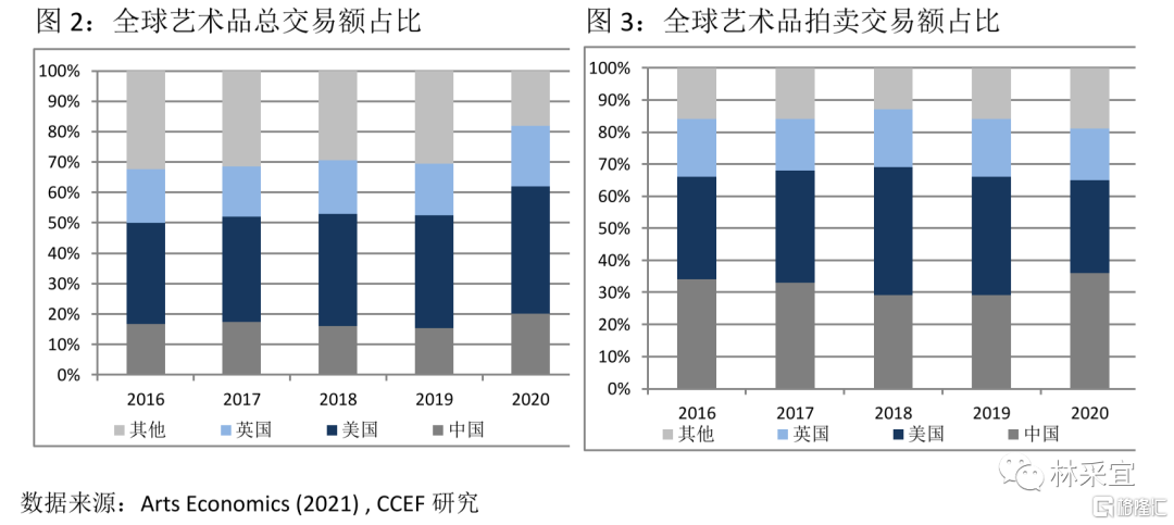 从成交渠道看,在一级市场销售(如艺术经纪人和画廊、艺博会销售等)与二级市场交易(拍卖)两大门类中,拍卖为艺术品在中国市场进行交易的主要途径,拍卖成交在艺术品交易总额中占比持续超过60%。过去十年中,大中华区在全球市场的艺术品成交份额稳定在20%左右,而公开拍卖渠道的成交额占比长期超过30%,2020年达36%,目前是全球最大的艺术品拍卖市场。