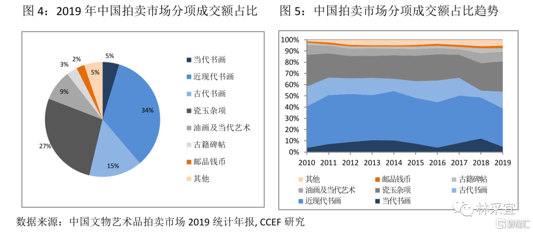 海外艺术投资者偏好当代艺术,国内投资者偏好古典艺术。中国境内拍卖市场成交价总额最高的前三品类分别为近现代书画、瓷玉和古代书画。形成这种市场结构的根本原因在于我国当代艺术市场的投机性强于收藏性,而古典作品能更好地规避审美风格变迁或资本炒作带来的市场波动,因此保值增值功能更稳定。