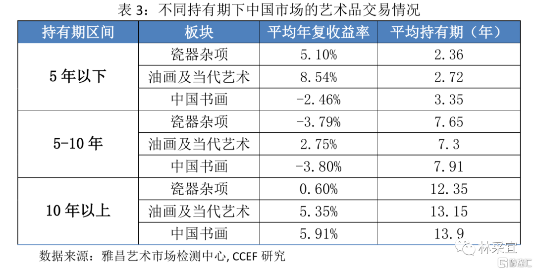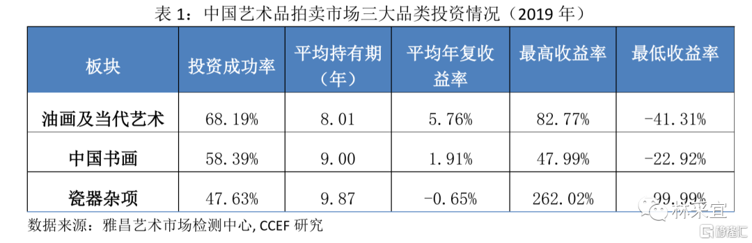 统计数据显示,当代艺术的风险收益率最高(平均年复合收益率为5.76%)、且持有期相对较短(8年)。与此同时,油画及当代艺术的投资成功率为68.19%,远高于中国书画的58.39%(以近现代书画和古代书画为主)和瓷器杂项的47.63%。