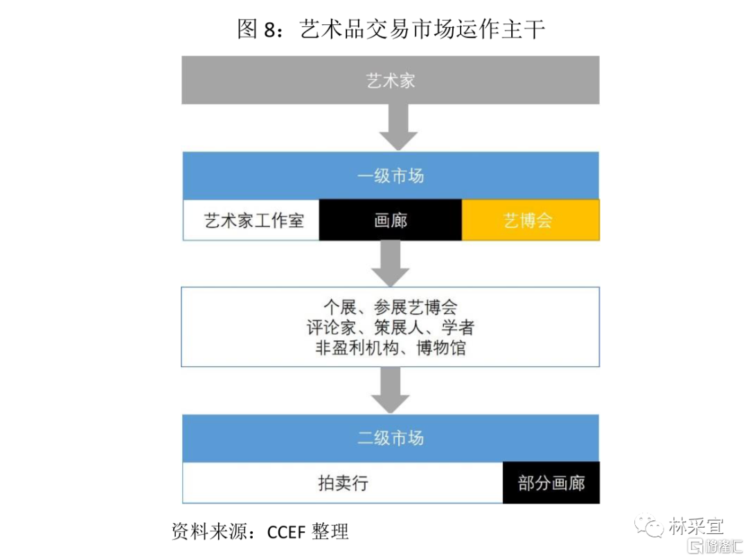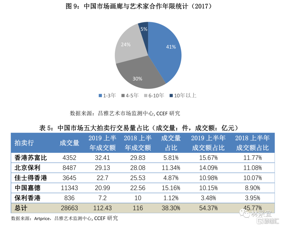 作为全球第二大艺术品市场,中国一级市场交易机构数量仅占全球总数量的9%,41%的画廊与签约艺术家合作期限在1-3年,进行10年以上合作的仅有5%,这意味着艺术家培养平台和价值评估体系缺失。(西方艺术界会将艺术家曾签约画廊的级别作为衡量其影响力的重要参考);此外,中国拍卖行集中度低且经常介入画廊交易,2019年五大知名拍卖行成交额在中国艺术品市场拍卖交易总量中占比仅为54%(美国艺术品市场上仅佳士得和苏富比两者的份额就超过了80%),众多良莠不齐的拍卖行成为了不规范交易的温床。由于艺术品投资估值评价体系缺失,头衔、过往拍卖纪录及人际关系等因素成为交易决策的依据。