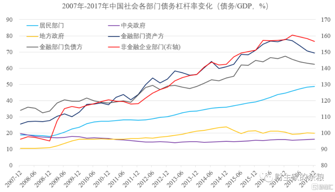 我們明顯可以看到,自2008年底之後,除了中央政府之外,其他所有部門的債務槓桿率,都出現了一路飆升。