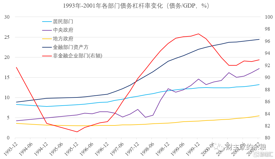 從1993年底到1995年底中國中央銀行體系正式建立,居民部門和非金融企業部門的債務絕對值增加了60%,分別從3000億和3.2萬億元左右,增長到5000億元和5萬億元左右;而中央政府負債和金融部門資產端,則是直接翻倍。