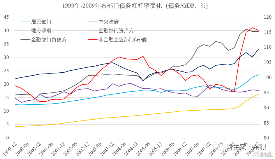 對社會經濟採用五部門劃分法——即居民部門、非金融企業部門、中央政府、地方政府以及金融部門,我們先來觀察,中國經濟崛起之初各部門的債務槓桿率。