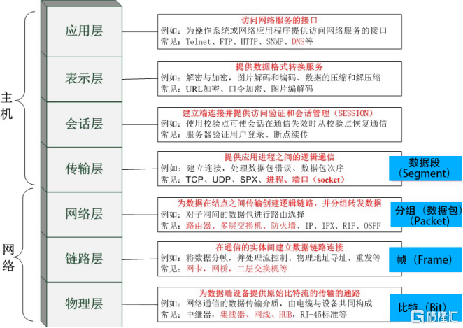 如下圖所示,OSI是一個七層的、抽象的模型體,不僅包括一系列抽象的術語或概念,也包括具體的協議。OSI中的上面4層(應用層、表示層、會話層、傳輸層)爲高層,定義了程序的功能;下面3層(網絡層、數據鏈路層、物理層)爲低層,主要是處理面向網絡的端到端數據流。