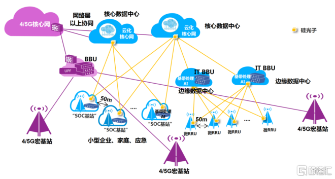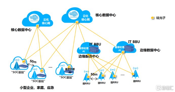 (3)6G時代的毫米波、太赫茲、可見光基站是白盒化、即插即用化、智能化。它會呈現“微基站”產品形態,問題在於:1、硅光子、基帶、無線、人工智能一體化的“SOC基站”?2、以MEC爲匯聚節點的硅光子、基帶、人工智能爲核心的“IT BBU”+硅光子、無線調頻、MIMO爲核心的“微RRU”。
