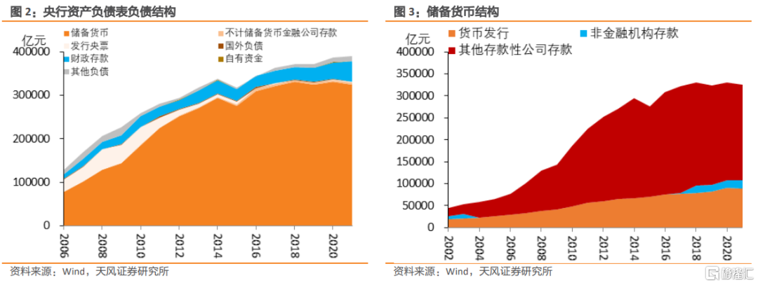 央行負債端主要包括儲備貨幣(基礎貨幣)、不計入儲備貨幣的金融性公司存款、發行央票、國外負債、財政存款、自有資金和其他負債。其中,儲備貨幣爲負債端佔比最大科目,主要由三個二級科目組成,分別是貨幣發行、準備金和非金融機構存款組成。
