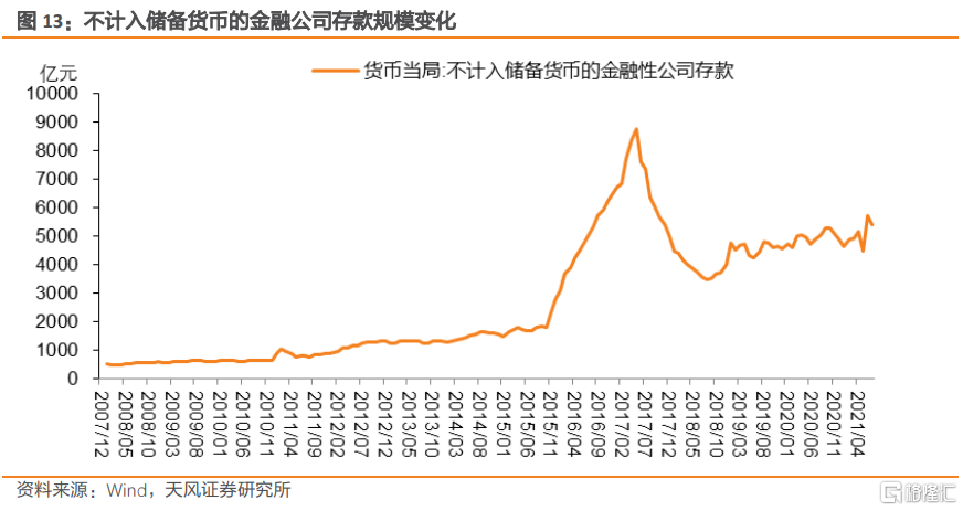 不計入儲備貨幣的金融性公司存款主要反映非存款性金融機構在央行的存款,是2008 年起新增設的科目,但一直以來佔比極低。該科目主要包括: