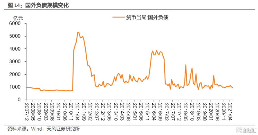 2011年1月開始,因爲統計口徑的調整,原來外國銀行在我國央行的存款從“儲備貨幣-其他存款性公司存款”調整至“國外負債”,這使得當時該科目出現大幅增長,之後的大幅下降則可能與資本流動有關。