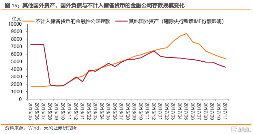 更重要的是,結合起來我們可以發現,2015年下半年-2017年初,資產端的其他國外資產提升,除了對應國外負債的增加,還很可能對應了不計入儲備貨幣的金融性公司存款的增加。