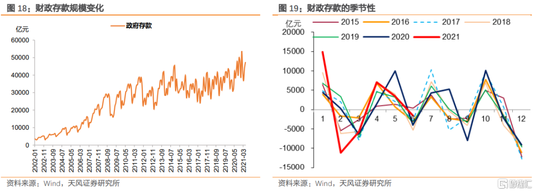 進一步拆分來看,由於財政收支的季節性特徵較強,政府性基金收支規模相對較小,所以最近幾年財政存款變動大部分是由政府債券淨融資來貢獻。