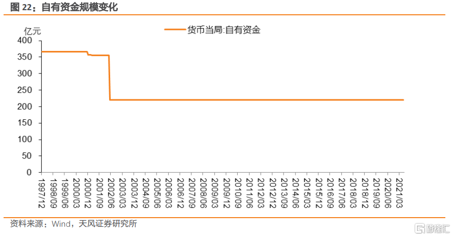 自有資金科目覈算的是央行資本金。因爲央行的全部資本由國家出資,所有“自有資金”即爲國家資本。自有資金在2002年出現一次性下降之後,至今保持穩定。