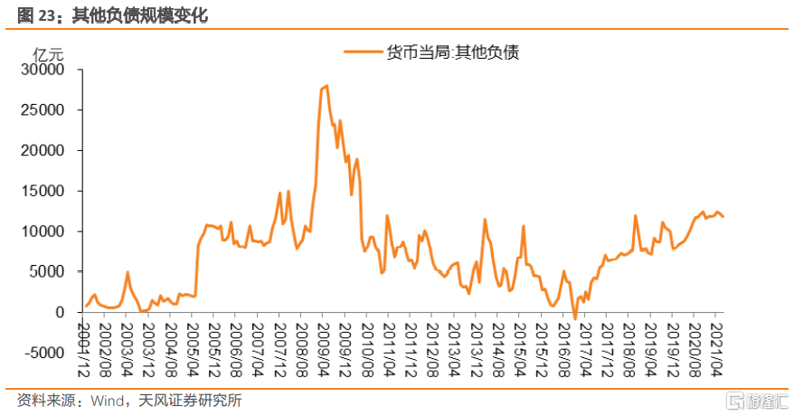 考慮到其他海外資產中包括銀行以外匯繳存的人民幣準備金,那麼該時期銀行以外匯繳存的人民幣準備金規模增加在負債端更可能對應的是不計入儲備貨幣存款,而非此前的其他負債。