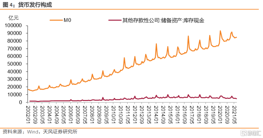 貨幣發行主要由流通中現金M0+商業銀行庫存現金組成,其中商業銀行庫存現金整體保持平穩,M0規模波動提升。