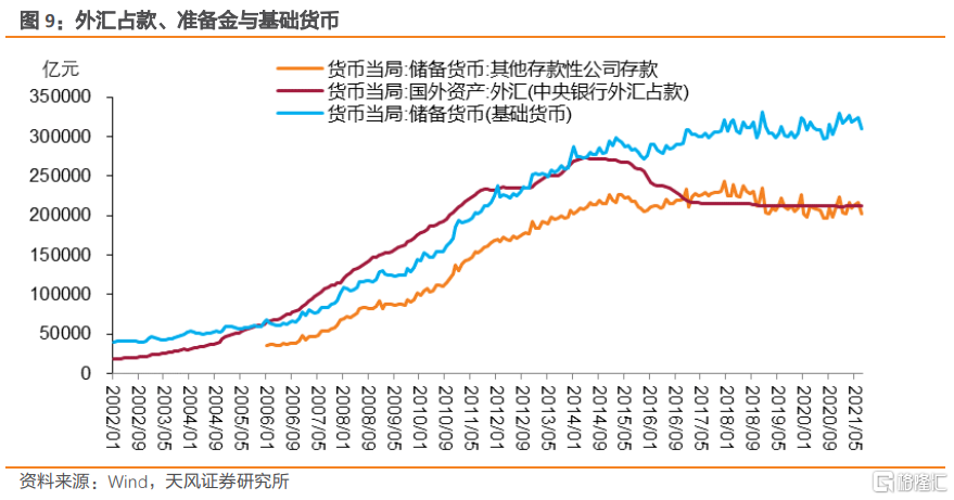 對於銀行來說,其與央行結匯之後,負債端的外匯存款會轉變成人民幣存款,而人民幣存款需要繳納法定準備金和形成超額存款準備金。對於央行來說,結匯之後對應其資產端的外匯佔款增長,而負債端則是多了存款準備金。因此,外匯佔款的變動對應是負債端基礎貨幣(特別是其中的準備金)的變動。