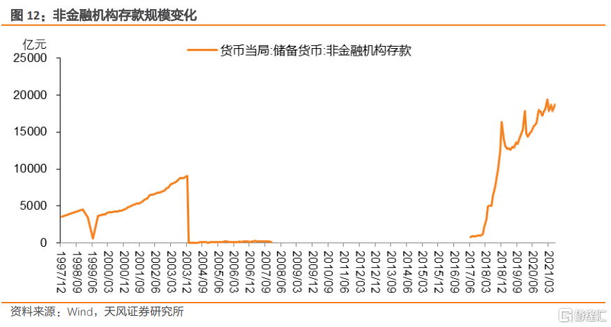 2003年之前的非金融機構存款可能是特定歷史背景下形成的,2004年之後該科目出現明顯下降,基本歸零。2008年該科目被刪除。