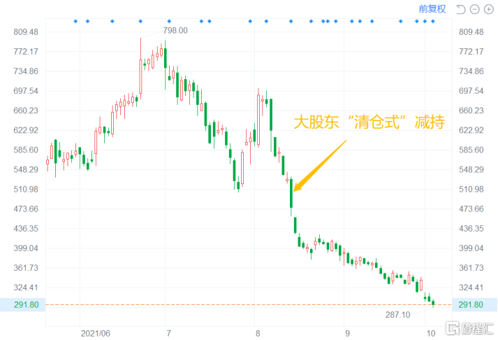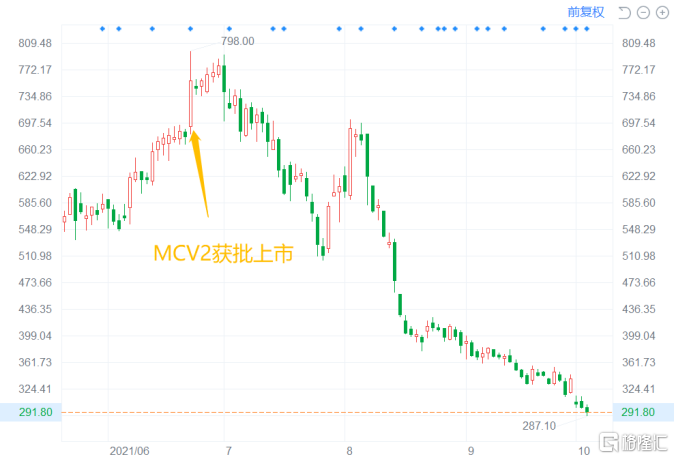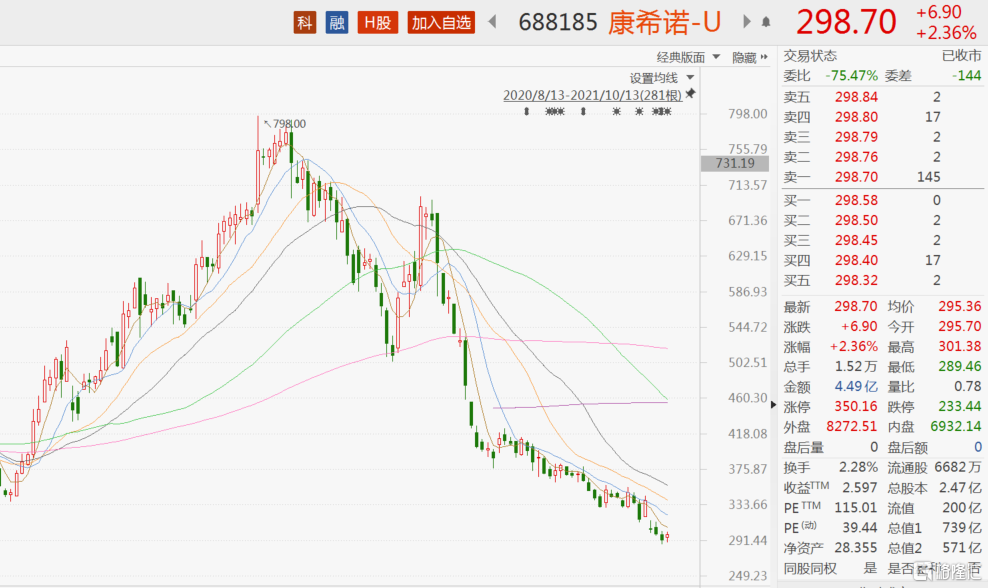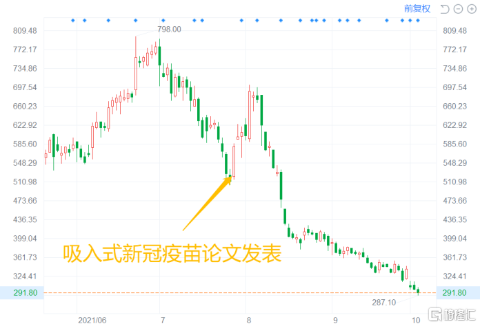 自7月以来,康希诺股价一泻千里,虽然受益于吸入式疫苗的研发短暂反弹,但套住不少投资者后,股价每况愈下,截至10月13日收盘,康希诺报价298.7元/股,较六月底历史最高点798跌近60%,A股市值仅剩七百余亿。