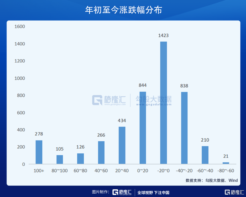 再看漲跌幅的數量分佈。漲幅40%以上的股票達756只,比例達16.7%,差不多每6只股票就有一隻,並且其中278只年初至今翻倍。另外,跌幅超過20%的有1069家,比例達到23.6%,差不多4只股票就有一隻,中雷比例很大了。