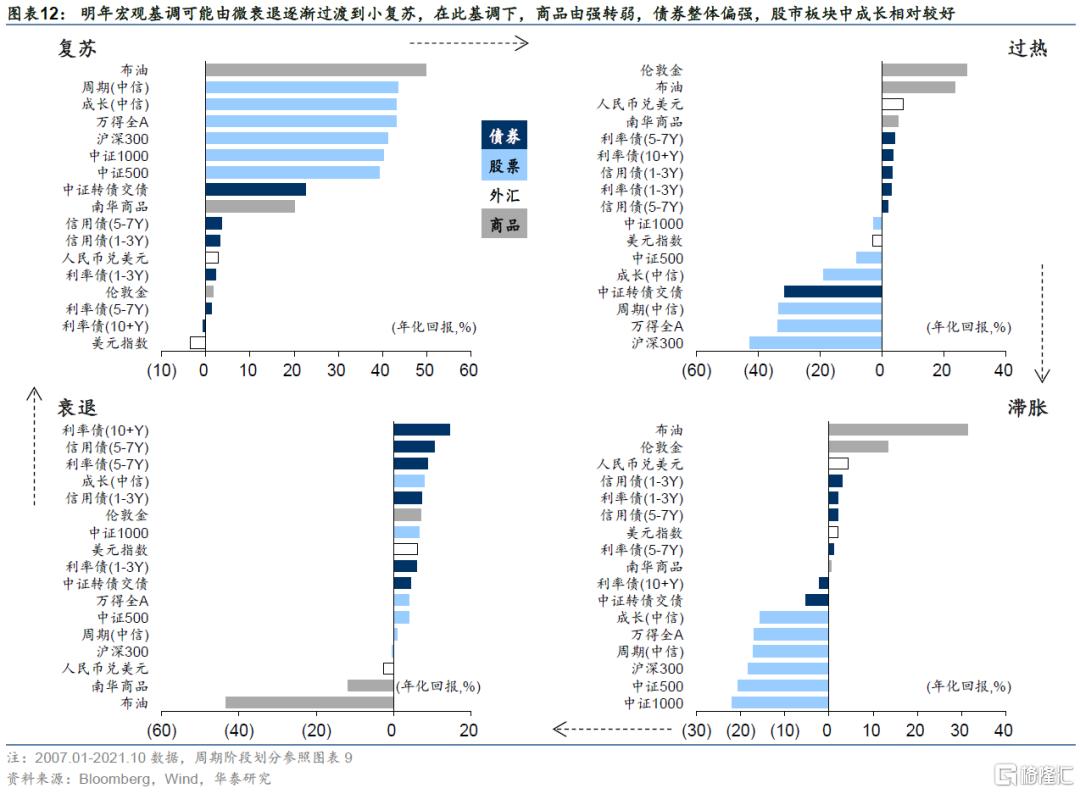 參考歷史上的高波動週期,在微衰退→小復甦的過程中,跨資產來看,商品先走弱再修復,債券由強轉弱、由利率逐漸過渡到信用,股市逐漸走強,行業風格由成長、必需消費逐漸輪動到週期板塊。