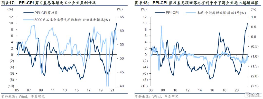 企業盈利表現可能比名義GDP弱,關注PPI-CPI剪刀差收斂的資產表現啓示。今年我國復甦的特徵是外需>內需、製造業>服務業,疊加低碳轉型和能耗政策,使得大宗商品供需階段性呈現明顯的失衡狀態,上遊原材料價格帶動PPI走高,CPI則在豬週期見底回升的過程中保持相對穩定,PPI-CPI剪刀差一度放寬至近10年以來峯值水平。但隨着美聯儲逐漸關注通脹問題,縮減QE開始,市場對美聯儲加息預期也開始回升,我國增長驅動力由城鎮化向低碳化轉型,地產大週期已開始回落,全球總需求對大宗商品價格的支撐邊際轉弱,PPI-CPI剪刀差有望收窄,利潤在上下遊間重新分配,相對而言宏觀環境更有利於中下遊企業的“困境反轉”行情。