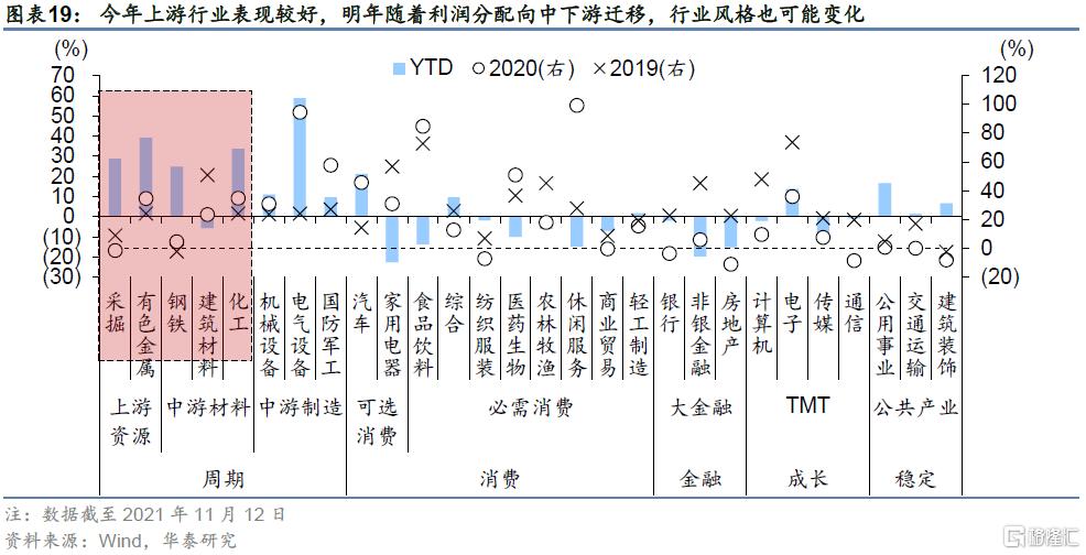 隨着大宗商品價格轉爲震盪,內需逐漸接棒外需成爲經濟修復主導力量,PPI-CPI剪刀差收窄,利潤在產業鏈各環節間再分配,中下遊行業成本端壓力緩解,關注紡服、機械等行業“困境反轉”機會。今年以來,在資源國疫情多輪反覆影響開採和物流、OPEC+增產偏緩、全球低碳化轉型及國內能耗雙控等多方面因素影響下,大宗商品價格快速上升。但這一現象的成因供給端>需求端,從社零等數據觀察,終端消費並不旺盛,PPI未能有效傳導到CPI,上遊資源行業價升量跌、業績好轉,中下遊行業成本擡升但提價彈性不足,業績承壓。展望明年隨着大宗商品價格企穩、雙循環背景下內需整體好轉,中下遊行業或存在“困境反轉”的佈局機會。
