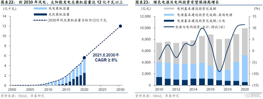 雙循環發展格局下,減碳發展轉型可能帶來新的經濟增長點,當前相關產業仍然在發展期,或孕育新的投資機會。自改革開放以來,城鎮化特別是房改以後帶來的房地產產業鏈拉動是我國經濟發展的重要內因。隨着城鎮化率達到60%、人口增速下行、房地產去金融化,房地產相關產業鏈對經濟的支撐力度也將弱化,低碳轉型或新的增長點。根據清華大學研究 ,實現1.5℃的溫控目標,2020-2050年需要新增能源系統相關投資約138萬億,超過每年GDP的2.5%,且能源系統轉型還可能進一步創造就業,新能源相關產業單位產能就業人數較傳統能源產業可提升0.5-2倍。政策層面也在加緊推出,10月24日中共中央、國務院正式印發《關於完整準確全面貫徹新發展理念做好碳達峯碳中和工作的意見》,雙碳目標“1+N”政策體系逐漸完善。11月8日人民銀行推出碳減排支持工具加以支持,增加銀行將信貸資源投放到相關領域的動力。相對利好新能源產業鏈,包括供能端的光伏、風電,用能端的新能源車,輸配電端的智能電網、儲能等行業板塊機會。