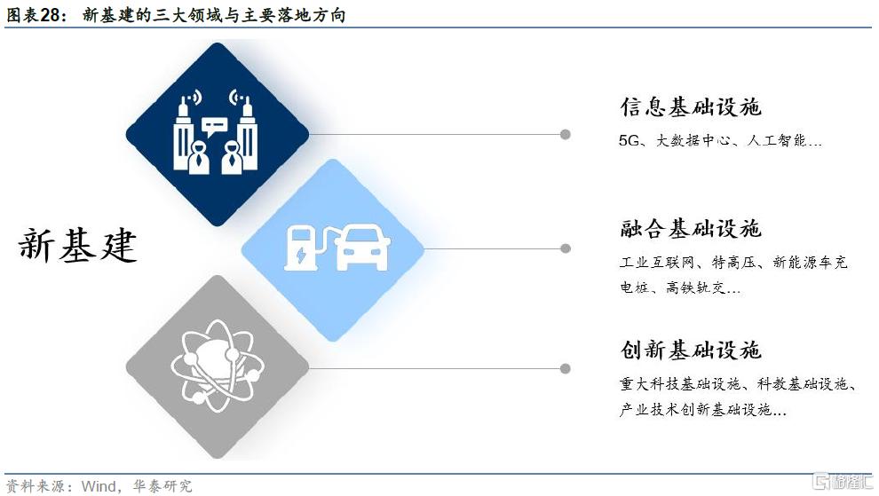 短期來看,我國明年一季度經濟放緩壓力較大,財政政策可能前置,逆週期對衝政策需要抓手。今年政策承上年疫情擾動,啓下年換屆“削山排雷”,相比穩增長,短期防範疫情衝擊與中長期改革更重要。但明年地產和出口下行可能性較高,消費能否恢復有賴於疫情控制情況,財政政策逆週期對衝仍有必要。資金端預算明年赤字(國債+地方一般債)我們預計3.7萬億左右+今年財政結餘等提供一定保證,項目端來看,新基建是確定性相對較高的發力方向,包括信息基礎設施、融合基礎設施、創新基礎設施三大領域,5G、大數據中心、人工智能、工業互聯網、特高壓、新能源車充電樁、高鐵軌交等主要落地方向可能受益。