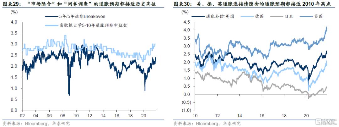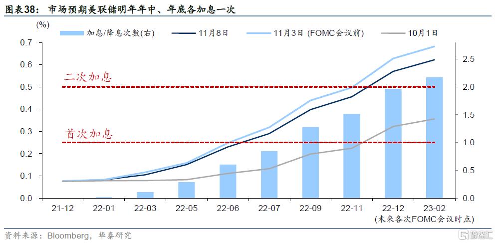 2、通脹壓力可能會增加美聯儲轉鷹並引導加息預期的可能。11月FOMC會議中鮑威爾對通脹“暫時性”(transitory)的表述有所弱化,而我們更加認同Bostic的“情節性”(episodic)滯脹的描述。預計2022年表觀通脹仍將位於2.5%上方,且後續拉動力將過渡至住房租金、服務業通脹等,但長期仍有望回到2%附近。但在中期選舉的大背景下,美聯儲更關注的通脹預期上行超出其能容忍的範圍,甚至出現失控風險,可能會加速其縮減QE的節奏;