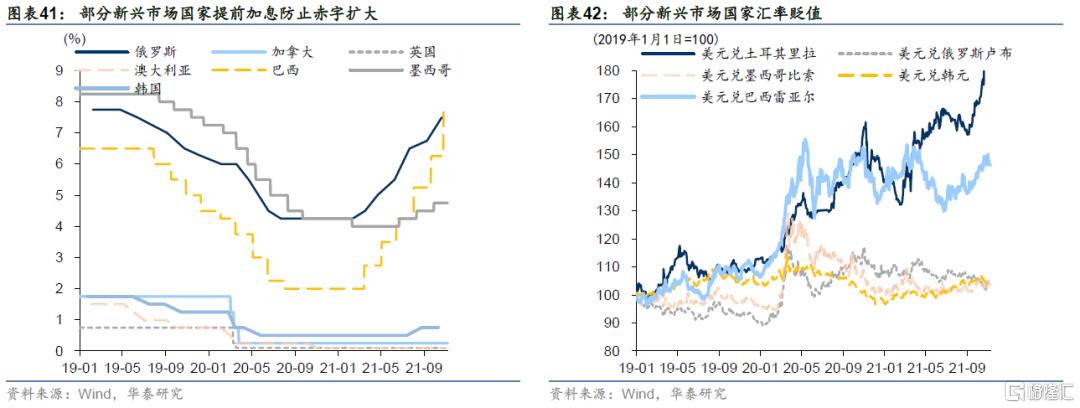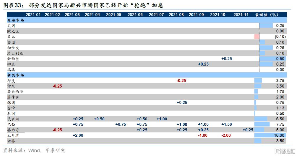 部分國家已經“搶跑”加息,但國內貨幣政策“以我爲主”、流動性“內外有別”,仍有利於結構性行情的演繹。借大宗商品整體走強的窗口期,部分基本面與之相關度較高的國家已經開始提前於美聯儲加息,以防範美元大幅走強、商品轉弱後可能的資本外流,但部分新興市場國家快速收緊會否與大宗商品供求再平衡、價格轉弱形成共振,從而引發新的風險事件,仍然值得關注。對我國而言,貨幣政策已於去年5月開始迴歸正常化,在調整節奏上領先全球,中美利差、人民幣匯率等仍處於舒適區間內,在經濟階段性下行壓力下,貨幣政策“以我爲主”特徵或將延續,疊加居民資產再配置趨勢,仍有利於結構性行情的演繹。