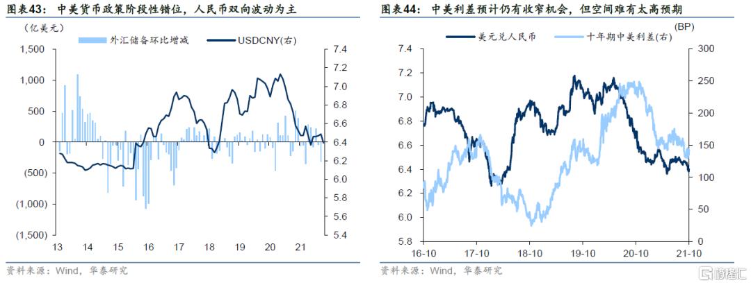我國面臨外部流動性弱化+內部流動性充裕的組合,貨幣政策整體易鬆難緊,但“以我爲主”的取向不會改變,海外流動性收緊影響有限。美聯儲帶動各國央行逐步開啓貨幣政策正常化、全球流動性邊際走弱。我國貨幣政策在經濟增長、物價穩定、內外平衡等多目標之間艱難平衡,供給約束下的經濟走弱貨幣政策有心無力,整體易鬆難緊。中美貨幣政策階段性錯位,可能造成人民幣小幅承壓。但考慮到貿易順差一直處於歷史高位,人民幣不具備貶值基礎,預計仍以雙向波動爲主。