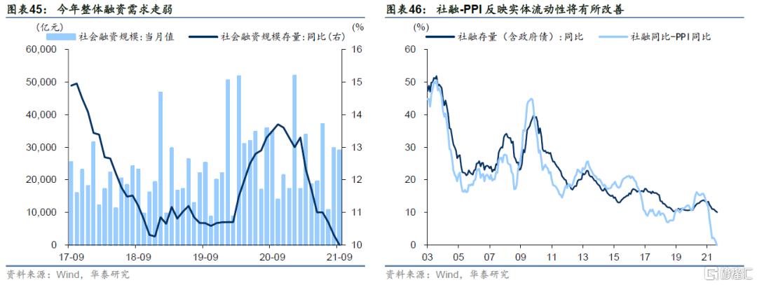 今年以社融-PPI爲代表的宏觀流動性創歷史新低,明年預計將有所改善。一方面社融持續下行,融資需求走弱來源於房地產監管趨嚴、地方債發行不及預期、信貸壓降等因素;另一方面PPI從海外供需錯位、轉爲國內供給約束而屢創新高。展望明年,穩增長訴求增強,地方債集中供給+地產信貸放鬆+基數效應→社融增速大概率回升,供需、流動性與基數效應影響下,我們預計PPI前三季度回落、四季度企穩,全年中樞約3%。社融-PPI企穩回升是確定性的方向,宏觀流動性將於明年有所好轉。
