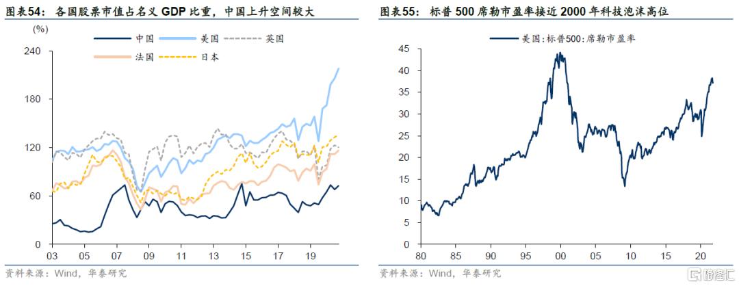 從全球資產橫向比價和居民財富構成等角度看,中國股票具有估值優勢。從估值來看,在海外流動性收緊、經濟復甦斜率放緩的背景下,中國與美國市場或全球其它主要市場相比,中國股票更有吸引力。中國股市總市值佔GDP的比重較發達國家仍有差距,長期來看居民財富向股市傾斜將爲股市持續提供流動性。股市總市值與同期名義GDP的比值可以反映資本市場發展情況,橫向看我國這一指標約爲70%,明顯低於美國(近220%),也低於其他主要發達國家,未來資本市場延續較快發展是大概率事件,居民資產再配置向股市傾斜、資本市場改革引入外資等力量將爲股市持續提供流動性。