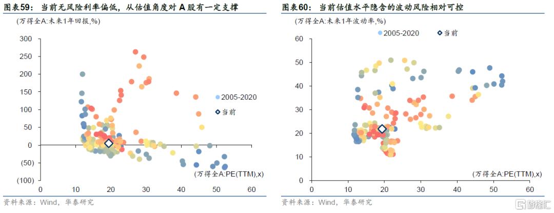 我們對資產配置價值的分析大體從預期回報、預期波動率、相關性三方面展開,前兩者決定資產間性價比,後者決定了短期來看戰略配置(定比例)和戰術配置(擇時)的相對重要性。而長期來看,預期回報、預期波動率又都與估值密切相關。股市角度,從預期回報與預期波動率角度衡量,當前不到20倍PE(TTM)的萬得全A隱含未來1年回報與波動率分別爲5%與22%左右,縱向比較來看都屬於偏低水平,風險回報比尚可。但由於進入存量博弈時代,結構性行情特徵將會更明顯,指數預判的主要作用是奠定全年至少保持基本權益倉位的基調。