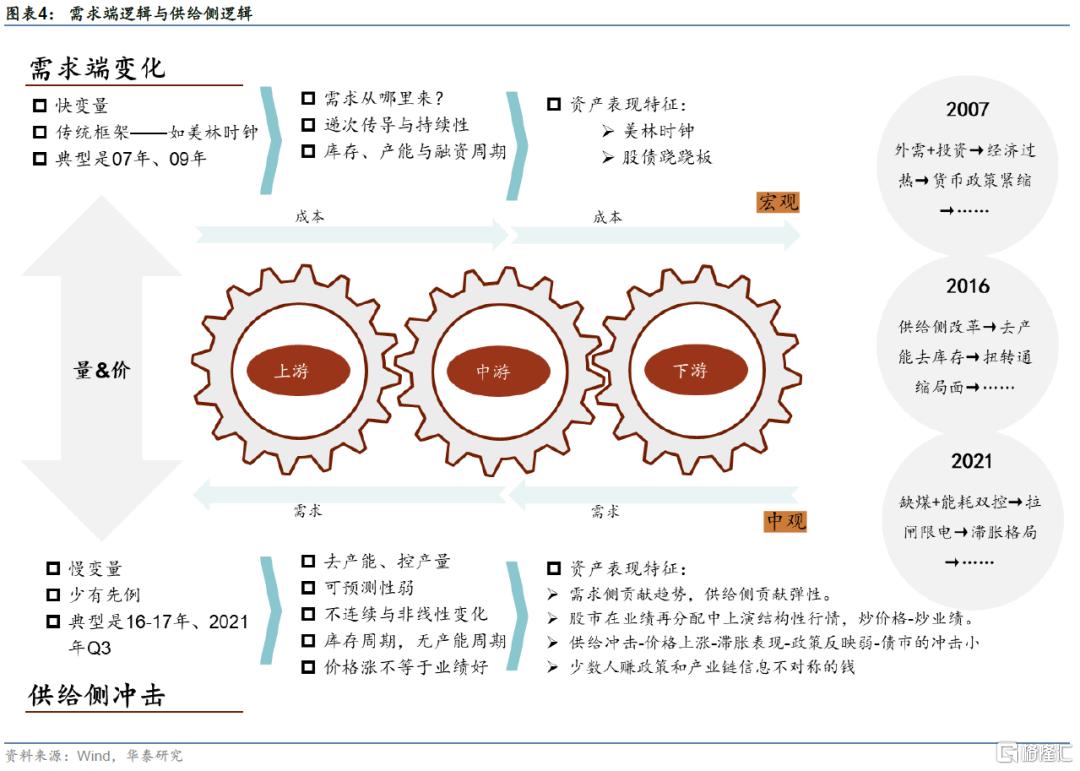 而從思考角度上,在傳統的經濟週期分析中,我們更習慣使用需求側分析框架,傳統套路是三駕馬車(投資、消費、外需)、貨幣財政逆週期政策、美林時鐘,但疫情後的全球經濟供給側擾動也不可忽視,需要新的思考維度。在傳統的經濟學理論裏有一種說法“短期看需求,長期看供給”,即是指一般情況下,短期內土地、勞動、技術、制度環境等供給側要素相對不變,彈性更高的需求貢獻了經濟的主要波動,故經濟短期內的調控政策往往更依賴於對總需求的刺激,此前使用基建、地產等對衝出口的不確定性。但2015年以後的市場環境變化向我們普及了供給側分析的重要性:短期在政策的推動下也可以成爲快變量,且市場的反應可能比需求側的驅動更爲劇烈。