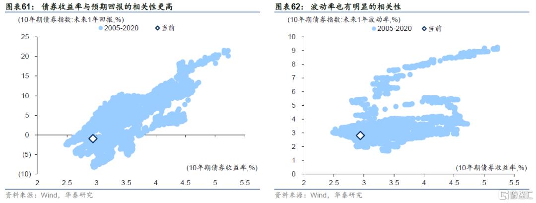 債券由於票息收益的存在,預期回報、預期波動率與絕對收益率水平的相關性更明顯。如果簡單參考歷史水平,未來回報預期不能有過高期待,關鍵是10年期國債收益率下限水平能否打開。