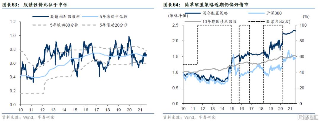 使用股債相對性價比指標進行回測驗證,使用這一直觀的指標構造出策略:1、期初,股、債佔比均爲50%;2、>80分位數,全倉滬深300;3、<20分位數,全倉10年期國債。這樣一個簡單的兼顧“估值”和“慣性”的策略,在2010 年以來的回測中已經明顯跑贏了單一資產類別。簡單配置策略目前仍出於“慣性”偏好債市,但估值信號逐漸迴歸中性。
