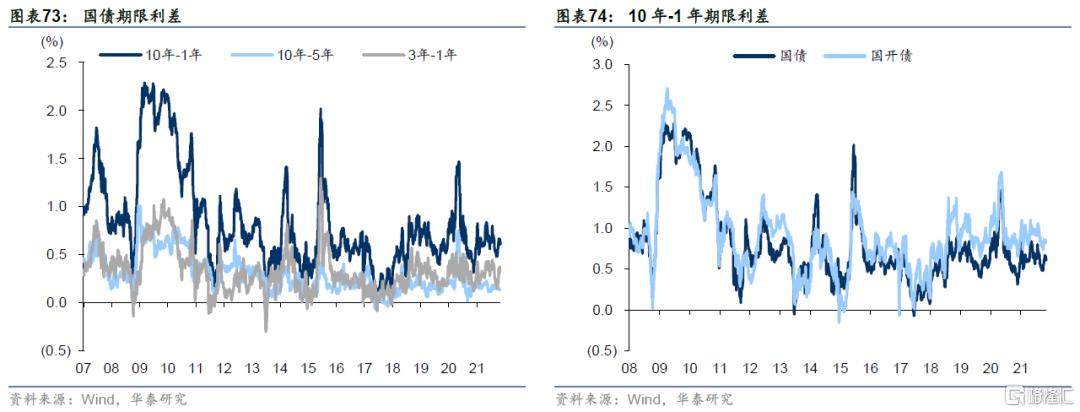 隨着經濟潛在增速放緩,10年期國債收益率曲線整體處於階梯下行的趨勢,從勝率和賠率角度看,3%及以上都是積極增持的區域。從曲線形態上,目前10-1年期限利差目前位於歷史中性水平,長端利率中樞在經濟潛在增速放緩、地產等融資主題萎縮影響下大概率呈下行趨勢,短端利率受資金端利率約束,向後看收益率曲線存在平坦化的壓力。我們預計明年十年期國債的高點在3.0-3.2%,需要趨勢性寬信用或理財大規模拋售等事件作爲觸發劑。從勝率和賠率角度看,我們認爲在3%及以上都是積極增持的區域。