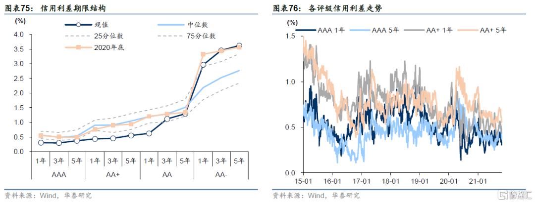 全球資產橫向看,中國資產估值有相對優勢,中美利差仍處於較舒適區間,明年或因美聯儲收緊貨幣政策而收窄。跨市場比較來看,股債性價比中性,股債預期回報和波動率位於歷史低位,當然縱向比較有侷限,結構性特徵更值得關注。股票在宏觀環境承壓、貨幣政策易鬆難緊下,估值水漲船高,結構分化仍存。債券利率中樞在下行區間,但空間打開需基本面催化,從勝率和賠率角度看,3%及以上是增持區域。中高等級信用利差仍處於較低位置。