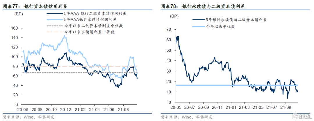 中高等級信用利差仍處於較低位置,信用債收益率走勢分化。目前AAA、AA+和AA評級1-5年信用利差位於2009年以來歷史25%分位附近,而AA-信用利差位於歷史75%分位數以上。今年在結構性資產荒、流動性充裕背景下,機構難做信用下沉、轉向品種下沉。盈利帶動基本面修復,產業債偏好修復;政策抑制城投無序融資,城投債低等級利差走闊明顯。永續債、二級資本債、私募債、ABS等品種溢價壓縮。理財淨值化後對短久期、高等級偏好或進一步增加,低等級、長久期、私募利差面臨走闊壓力。