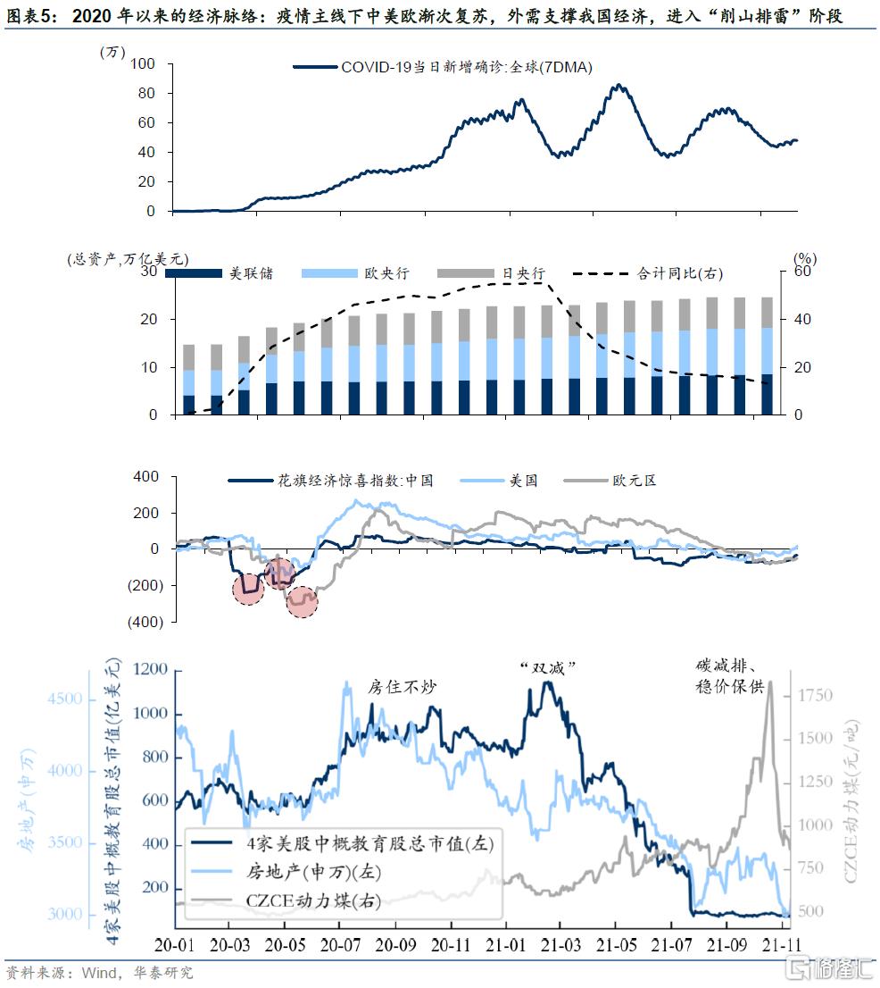 回顧去年起的宏觀主線,呈現出如下特徵:第一,2020年到今年,疫情是最大的基本面和宏觀經濟主線,海外貨幣財政雙寬鬆刺激貢獻需求、中國疫情控制得力負責生產,外需成爲支撐國內經濟的核心。復甦順序呈現外需>內需、製造業>服務業等特徵;第二,今年下半年,在經濟增長壓力較小的窗口,“削山排雷”的關鍵時期,做長期正確的事情;
