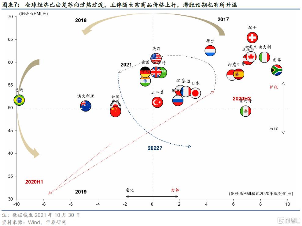美聯儲結束貨幣政策寬鬆將貫穿明年全年的市場主線,縮減QE持續推進,滯脹與加息預期升溫,全球流動性邊際收緊。美聯儲已於11月FOMC會議正式宣佈縮減QE,將從11月開始每月分別減少購買100億、50億美元的美債和MBS,按此計劃,預計美聯儲將於明年6月完成QE縮減,全球流動性邊際趨緊的趨勢已經基本明確,但美國中期選舉臨近、通脹會否超預期進而影響美聯儲的決策函數仍是重要關注點,特別是原油價格及主要受其影響的TIPS通脹補償率是風向標。