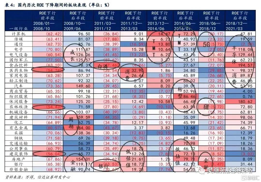 歷史上,在整體A股ROE下滑的前半段,整體市場表現爲下跌,漲跌幅差異很小(一般最好和最差板塊差異不超過20%),ROE下滑的後半段漲跌幅差異很大(40%—100%)。金融股更容易在ROE下降階段有超額收益,成長或消費類板塊在ROE下滑的後半段也會有明顯的超額收益。