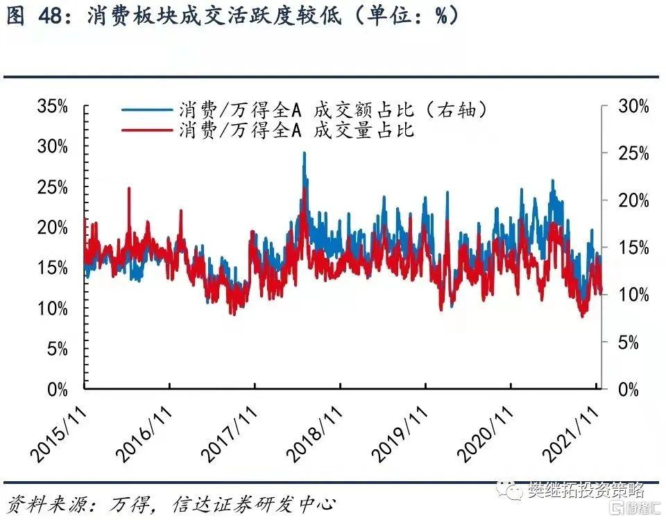 2021年消費板塊的調整原因可以歸結爲兩點,分別是交易擁擠和業績相對優勢下降。前期大級別的回撤、估值的下降、成交活躍度的降低、基金持倉比例持續回落,都表明消費板塊的交易擁擠情況已明顯緩解。很多機構投資者對盈利穩定的消費板塊有習慣性的配置偏好,當消費板塊的性價比提升時會提高配置的傾向。交易擁擠的緩解是當前消費板塊出現季度級別的反彈機會的主要原因。