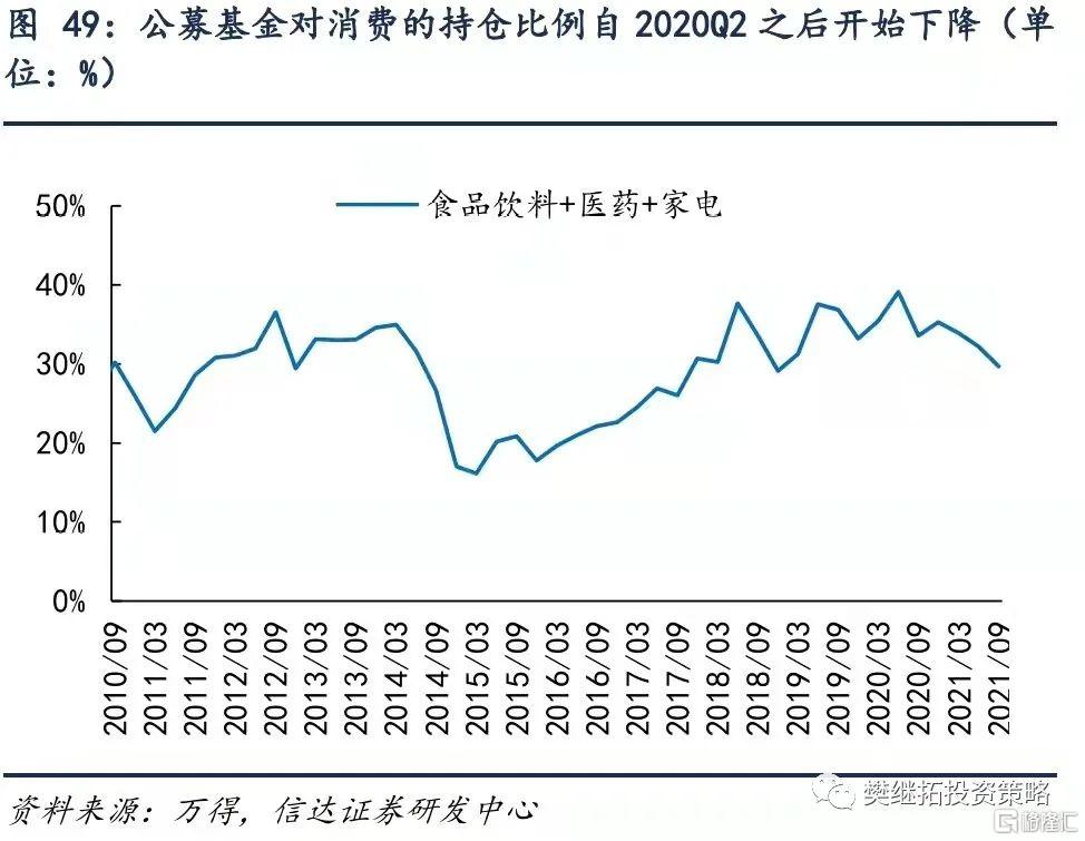 公募基金對熱門消費行業的持倉比例已經下降了一段時間。截至2021Q3,公募基金對食品飲料行業的持倉比例爲15.07%,對醫藥生物行業的持倉比例爲13.21%,對家用電器行業的持倉比例爲1.4%,三者合計爲29.69%。從趨勢上來看,2020Q2之後,公募基金食品飲料、醫藥、家電行業的加總持倉比例持續下降,2021Q3較2020Q2下降了9.44個百分點。基金對於消費板塊的持倉比例已經非常接近2018年底的水平。