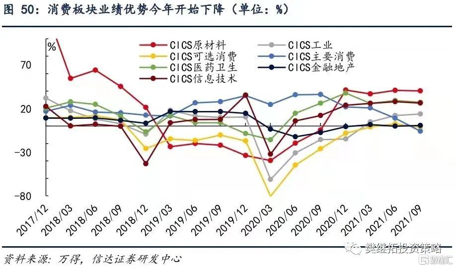而消費板塊業績相對優勢的下降主要源於兩方面因素。其一,消費板塊自身目前面臨上遊漲價與下遊需求不振的雙重壓力,其二,週期股業績的爆發進一步削弱了消費板塊的業績相對優勢。目前消費板塊基本面反轉帶來業績相對優勢回升的邏輯尚不清晰。可能存在的邏輯,一是PPI向CPI傳導帶來的漲價,二是上遊商品價格調整帶來成本壓力緩解。由基本面反轉帶來的更大級別的超額收益提升可能要等到明年年中之後。另外一個機會是受疫情壓制時間較長的航空&酒店,是2022年爲數不多的可能出現景氣拐點的行業。